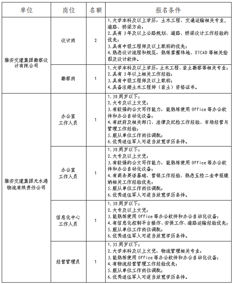 根據(jù)發(fā)展需要,決定面向社會(huì)公開(kāi)招聘雅安市交通建設(shè)(集團(tuán))有限責(zé)任公司(以下簡(jiǎn)稱“雅安交建集團(tuán)”)所屬子公司工作人員7名,現(xiàn)將有關(guān)事項(xiàng)公告如下: