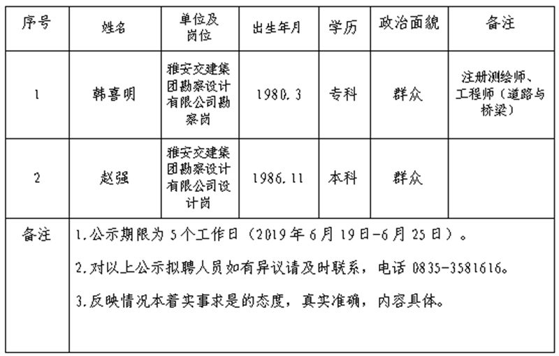 雅安交建集團(tuán)子公司擬聘用人員公示 (勘察設(shè)計公司)