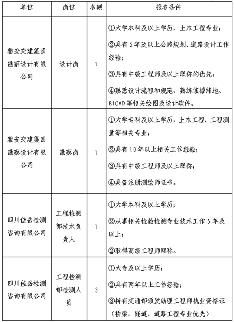 根據發(fā)展需要,決定面向社會公開招聘雅安市交通建設(集團)有限責任公司(以下簡稱“雅安交建集團”)所屬子公司工作人員6名,現將有關事項公告如下: