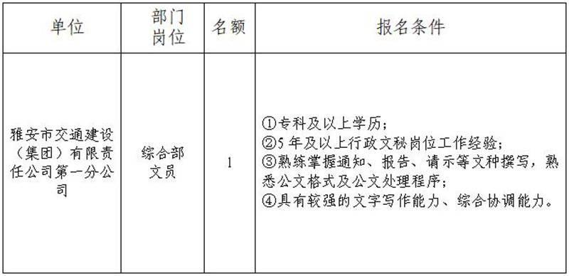 根據(jù)發(fā)展需要,決定面向社會公開招聘雅安市交通建設(shè)(集團(tuán))有限責(zé)任公司(以下簡稱“雅安交建集團(tuán)”)所屬分公司工作人員1名,現(xiàn)將有關(guān)事項(xiàng)公告如下: