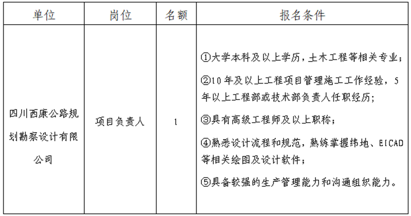 根據(jù)發(fā)展需要,決定面向社會(huì)公開(kāi)招聘雅安市交通建設(shè)(集團(tuán))有限責(zé)任公司(以下簡(jiǎn)稱“雅安交建集團(tuán)”)所屬子公司項(xiàng)目負(fù)責(zé)人1名,現(xiàn)將有關(guān)事項(xiàng)公告如下: