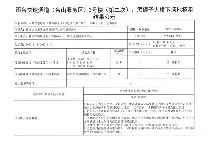 雅安交建集團(tuán)交通資源開發(fā)有限責(zé)任公司雨名快速通道(名山服務(wù)區(qū))3號(hào)樓(第二次)黑碾子大橋下場地招租結(jié)果公示