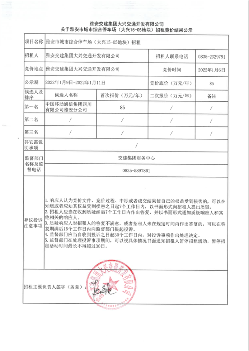 大興開(kāi)發(fā)公司關(guān)于雅安市城市綜合停車(chē)場(chǎng)(大興15-05地塊)招租競(jìng)價(jià)結(jié)果的公示
