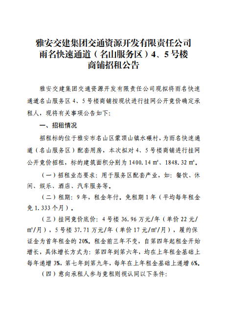 雅安交建集團交通資源開發(fā)有限責(zé)任公司雨名快速通道(名山服務(wù)區(qū))4、5號樓招租公告附件