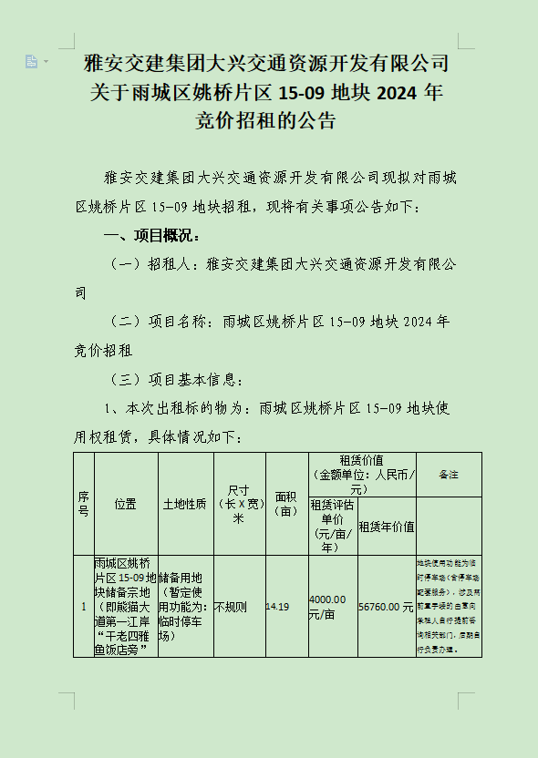 雅安交建集團(tuán)大興交通資源開(kāi)發(fā)有限公司關(guān)于雨城區(qū)姚橋片區(qū)15-09地塊2024年競(jìng)價(jià)招租的公告