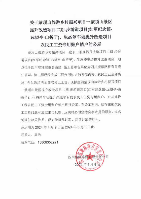 關于蒙頂山旅游鄉(xiāng)村振興項目一蒙頂山景區(qū)提升改造項目二期-步游道項目(紅軍紀念館遠望亭-山折子)、生態(tài)停車場提升改造項目農民工工資專用賬戶銷戶的公示