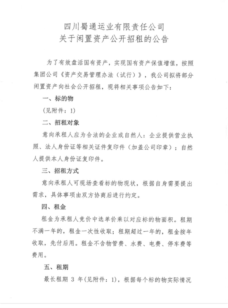 蜀通運(yùn)業(yè)有限責(zé)任公司關(guān)于閑置資產(chǎn)公開招租的公告附件
