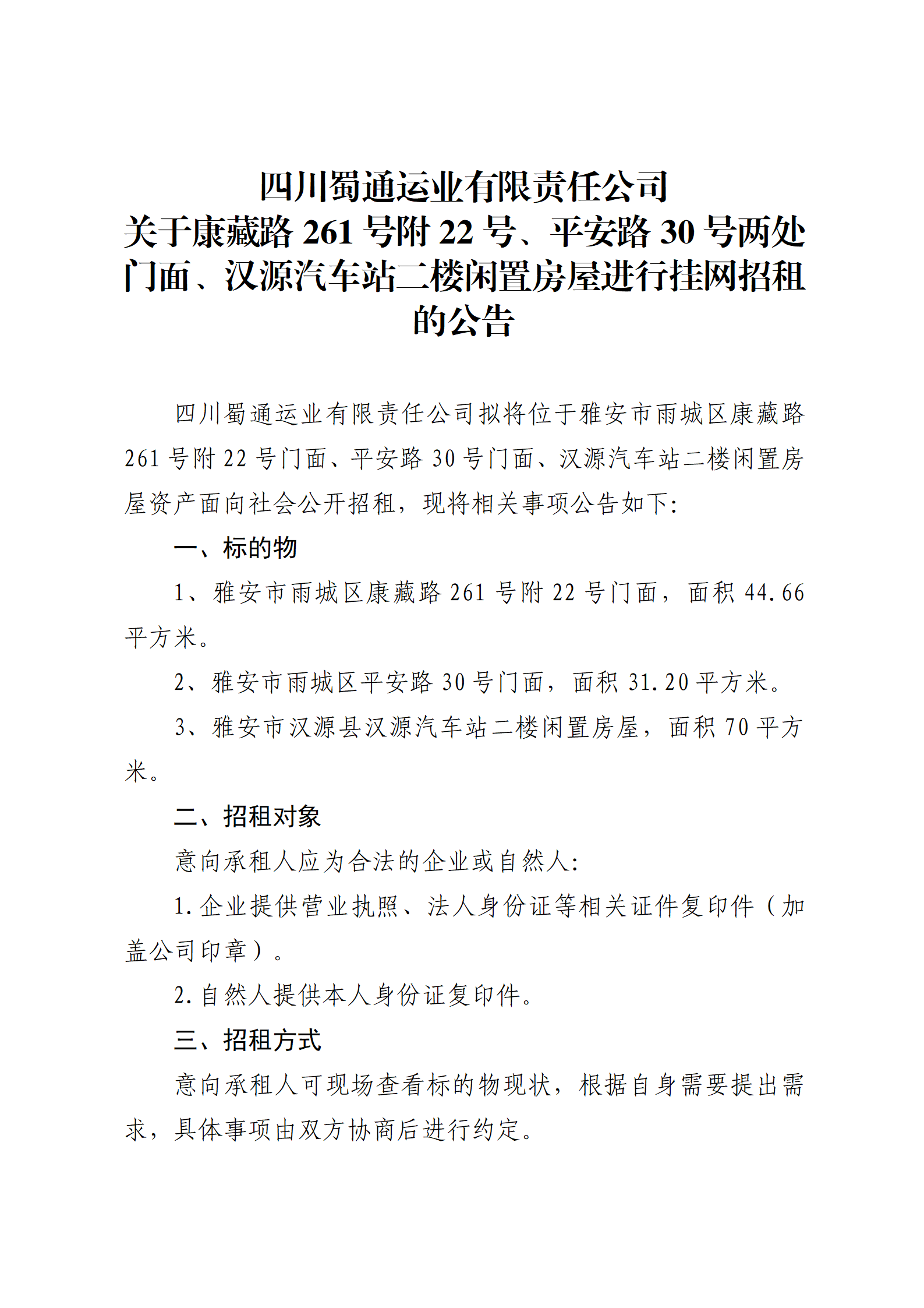 四川蜀通運業(yè)有限責任公司 關(guān)于康藏路261號附22號、平安路30號兩處門面、漢源汽車站二樓閑置房屋進行掛網(wǎng)招租的公告