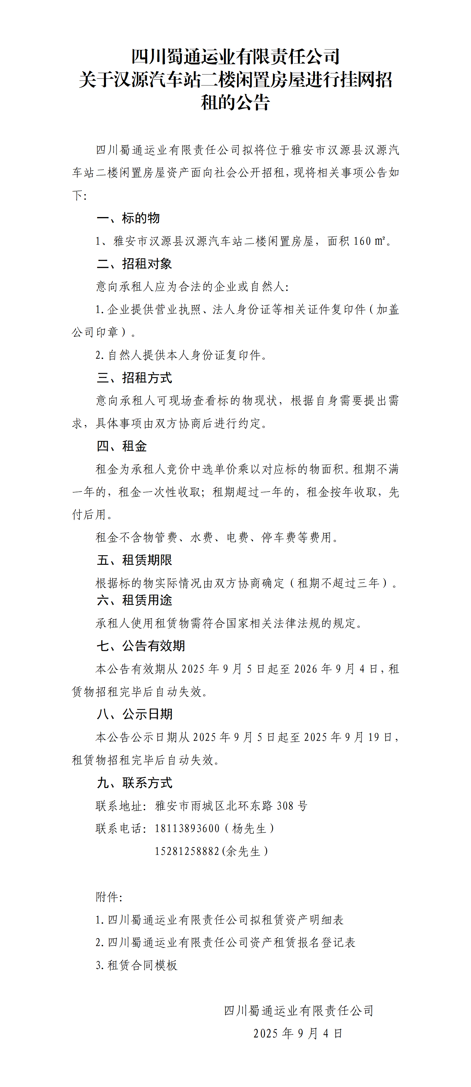 四川蜀通運業(yè)有限責任公司 關(guān)于漢源汽車站二樓閑置房屋進行掛網(wǎng)招租的公告