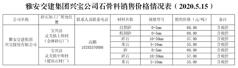 雅安交建集團興寶公司砂石骨料銷售價格情況表(2020.5.15)