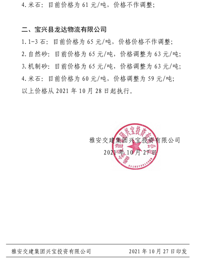 雅安交建集團(tuán)興寶公司關(guān)于調(diào)整成品料銷售價格的通知(2021.10.26)