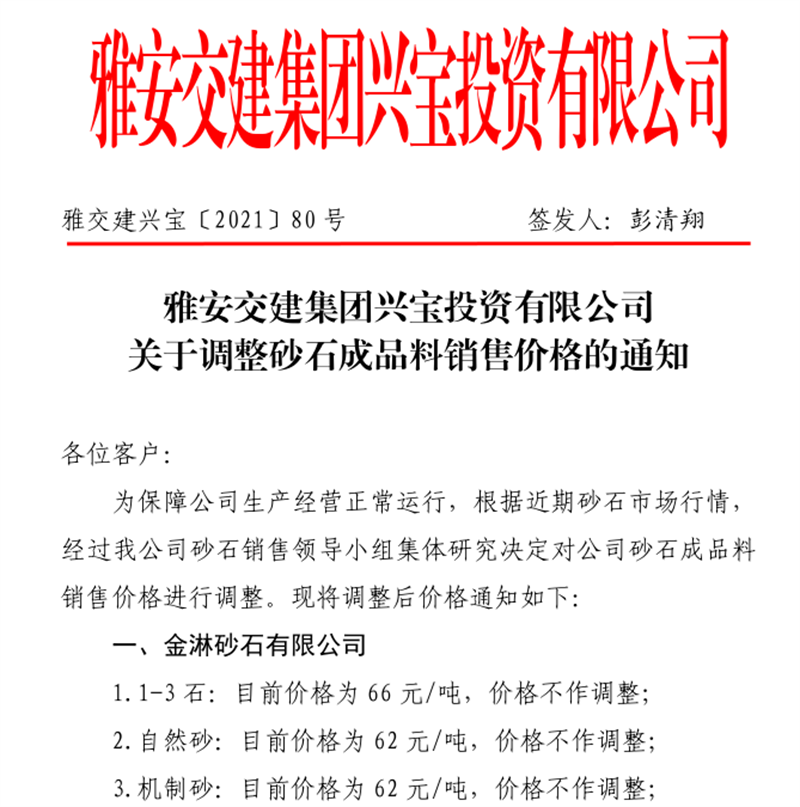 雅安交建集團(tuán)云石公司關(guān)于調(diào)整成品料銷售價格的通知(2021.11.4)