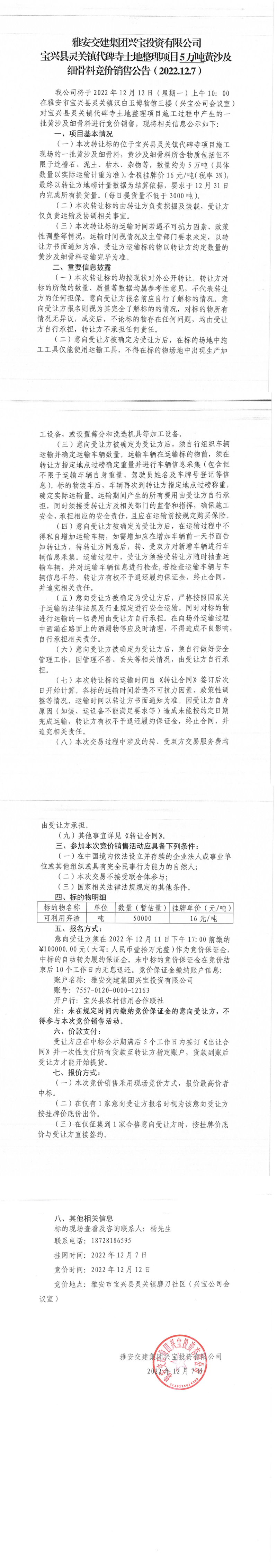 雅安交建集團(tuán)興寶投資有限公司寶興縣靈關(guān)鎮(zhèn)代碑寺土地整理項目一批黃沙及細(xì)骨料競價銷售掛網(wǎng)公告2022.12.7