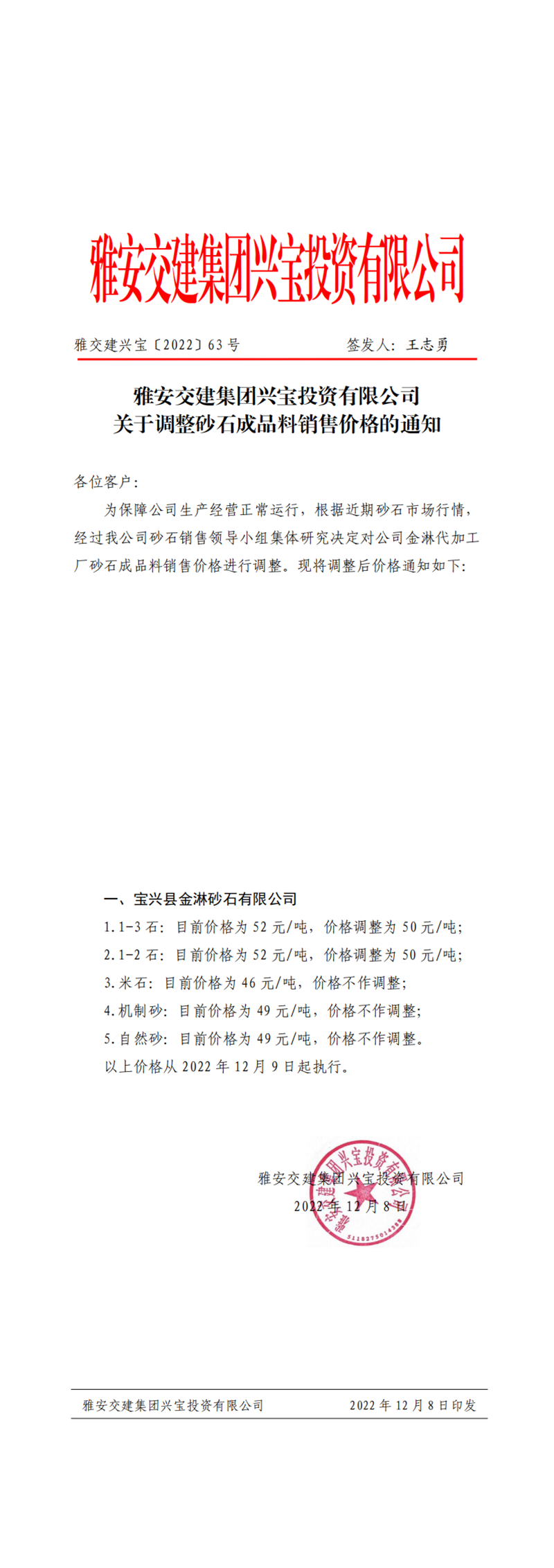 雅交建興寶〔2022〕63號 關于調整砂石成品料銷售價格的通知(2022-12-8)