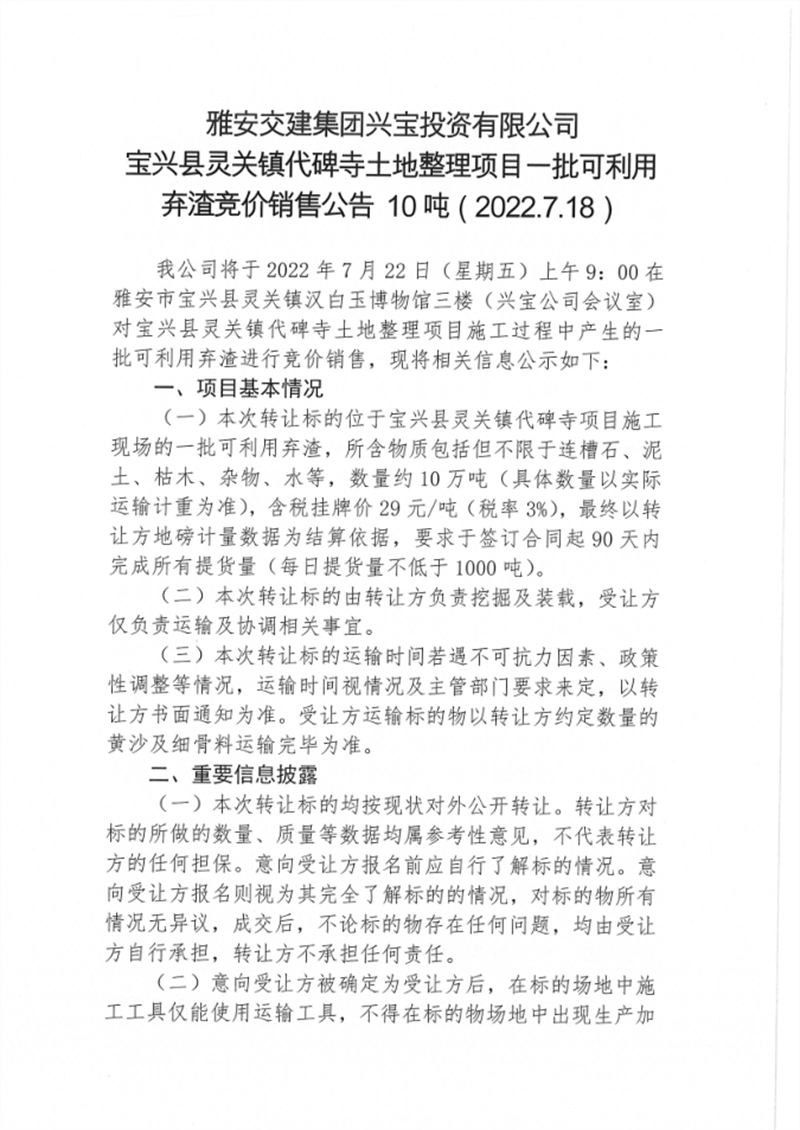 寶興縣靈關(guān)鎮(zhèn)代碑寺土地整理項目一批可利用棄渣競價銷售公告7.18(10萬噸)
