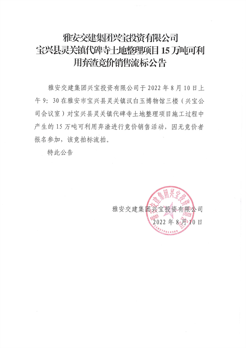雅安交建集團(tuán)興寶投資有限公司靈關(guān)鎮(zhèn)代碑寺土地整理項(xiàng)目15萬噸可利用棄渣競(jìng)價(jià)銷售流標(biāo)公告