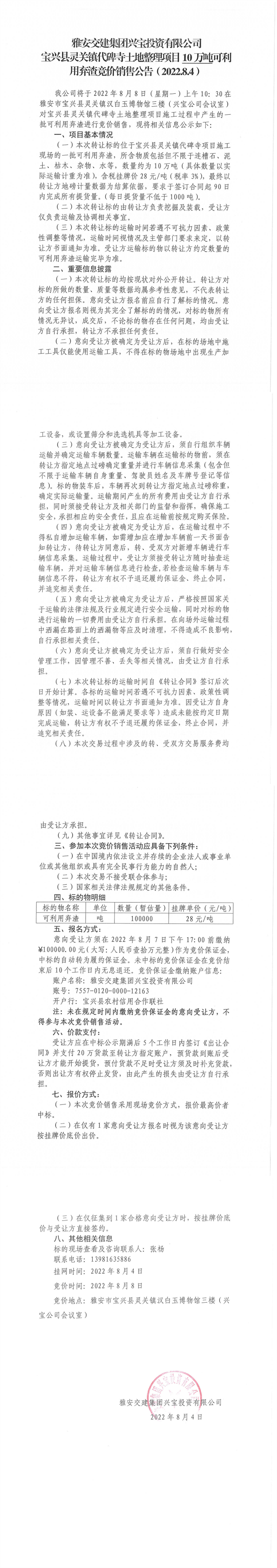 雅安交建集團興寶投資有限公司靈關(guān)鎮(zhèn)代碑寺土地整理項目10萬噸可利用棄渣競價銷售公告(2022.8.4)