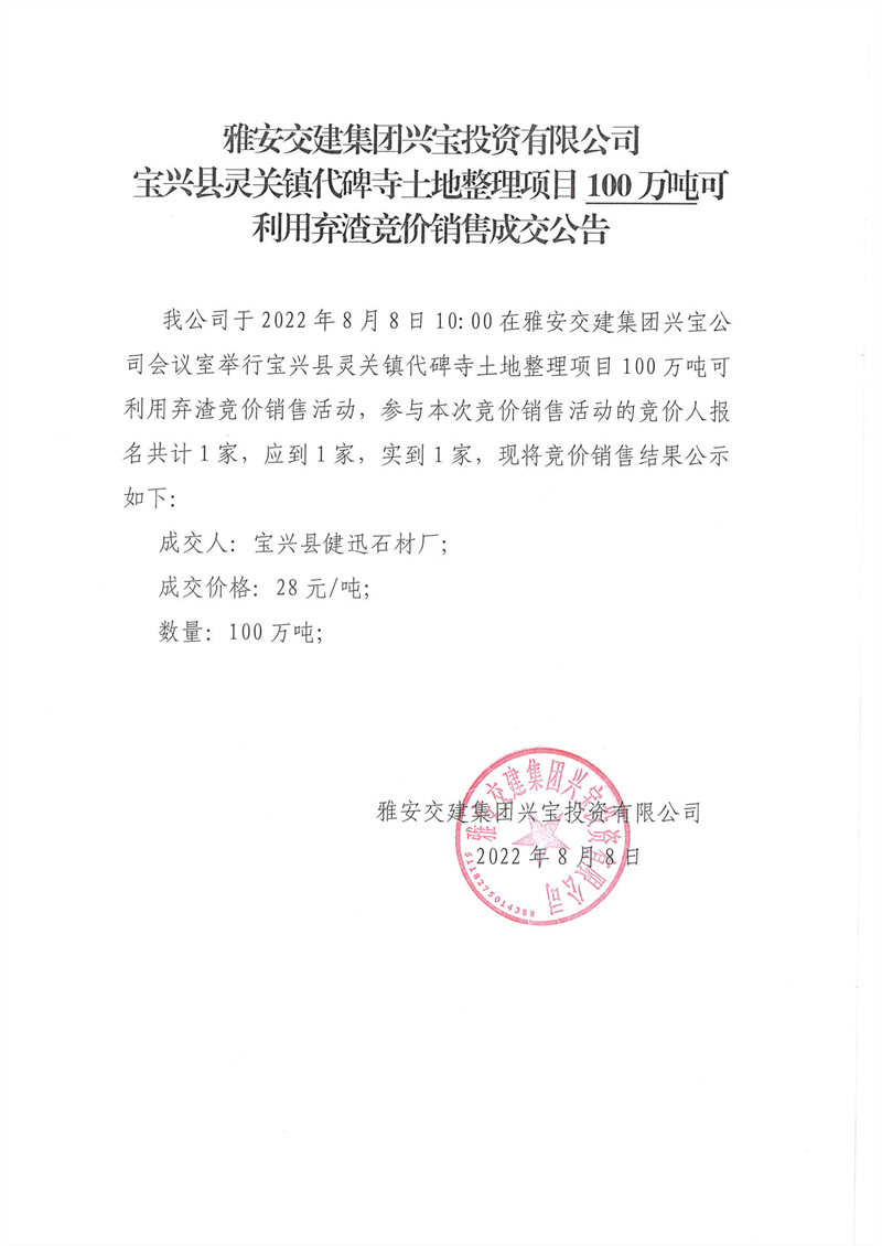 代碑寺土地整理項(xiàng)目10萬(wàn)噸可利用棄渣競(jìng)價(jià)銷(xiāo)售成交公告