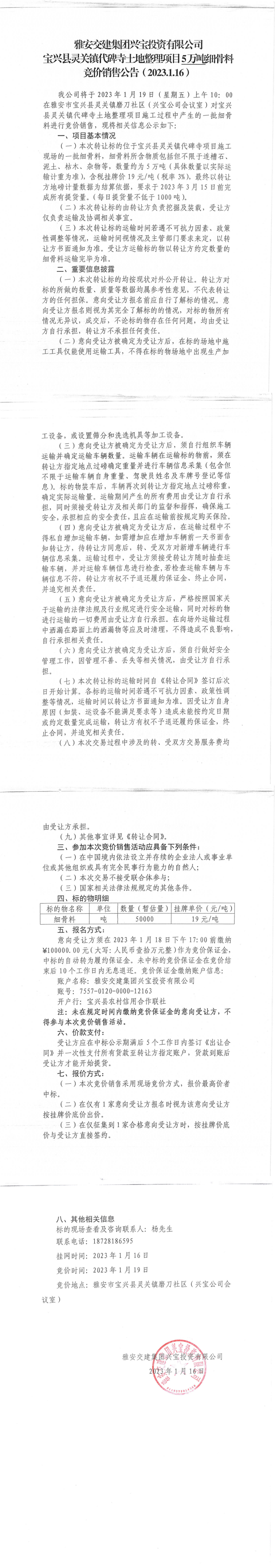 雅安交建集團(tuán)興寶投資有限公司寶興縣靈關(guān)鎮(zhèn)代碑寺土地整理項(xiàng)目5萬噸細(xì)骨料競價(jià)銷售公告(2023.01.16)