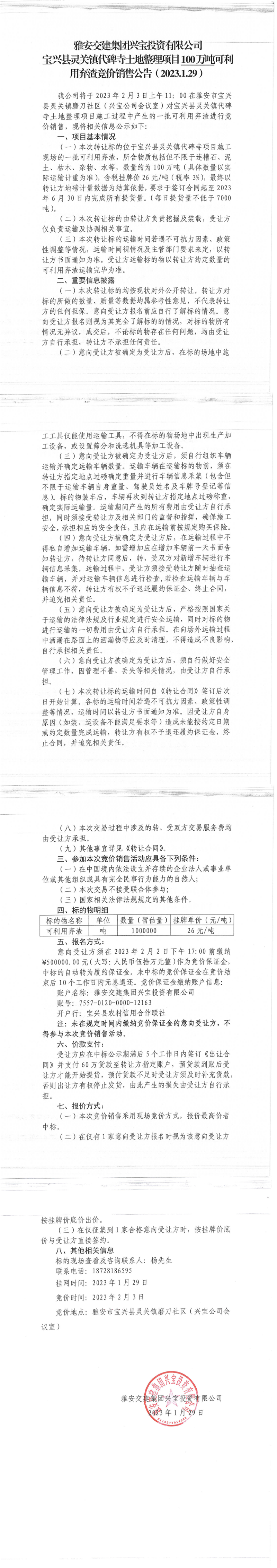 雅安交建集團(tuán)興寶投資有限公司靈關(guān)鎮(zhèn)代碑寺土地整理項(xiàng)目100萬噸可利用棄渣競價銷售公告(2023.1.29)