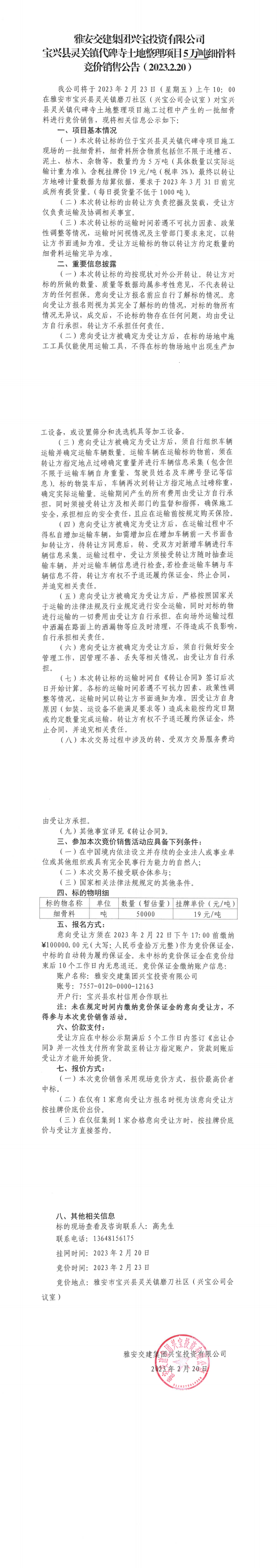 雅安交建集團(tuán)興寶投資有限公司寶興縣靈關(guān)鎮(zhèn)代碑寺土地整理項(xiàng)目5萬噸細(xì)骨料競(jìng)價(jià)銷售公告(2023.2.20)