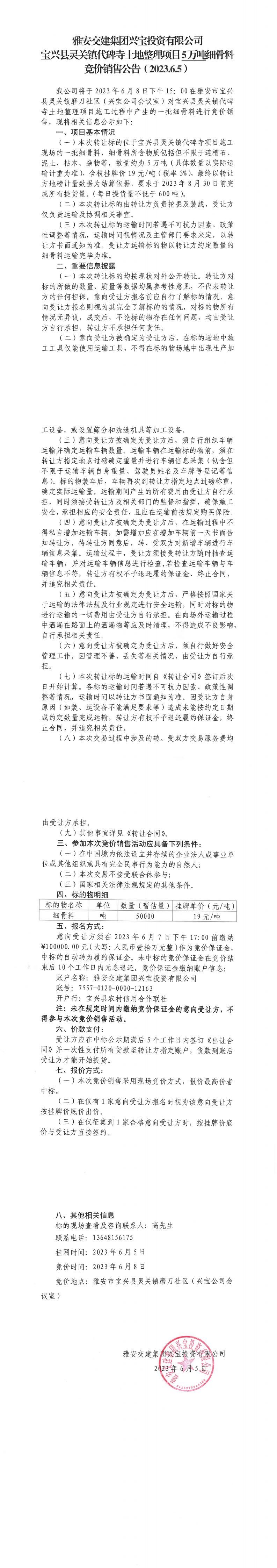 雅安交建集團(tuán)興寶投資有限公司寶興縣靈關(guān)鎮(zhèn)代碑寺土地整理項(xiàng)目5萬噸細(xì)骨料競(jìng)價(jià)銷售公告(2023.6.5)