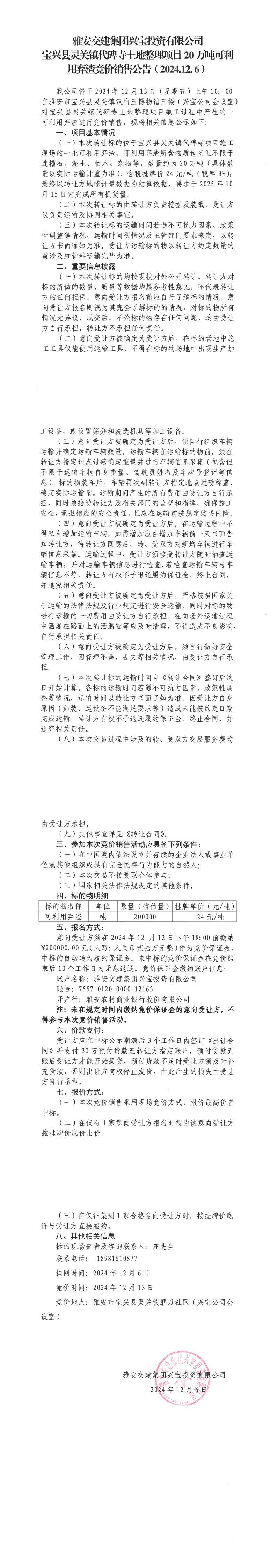 雅安交建集團(tuán)興寶投資有限公司靈關(guān)鎮(zhèn)代碑寺土地整理項(xiàng)目20萬噸可利用棄渣競價(jià)銷售公告(2024.12.06)